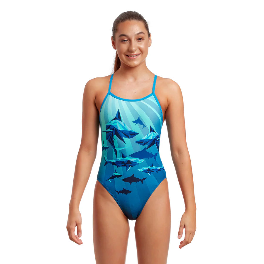 Der Mädchen Single Strap Badeanzug von Funkita hat einen sportlichen Rückenausschnitt, mit einem dünnen V-Träger, welcher dir bei deinem Training die nötige Bewegungsfreiheit bietet. Damit bei dem Badeanzug nichts durchschimmert, hat dieser ein Innenfutter im Frontbereich. Die Beinausschnitte haben eine normale Höhe.
