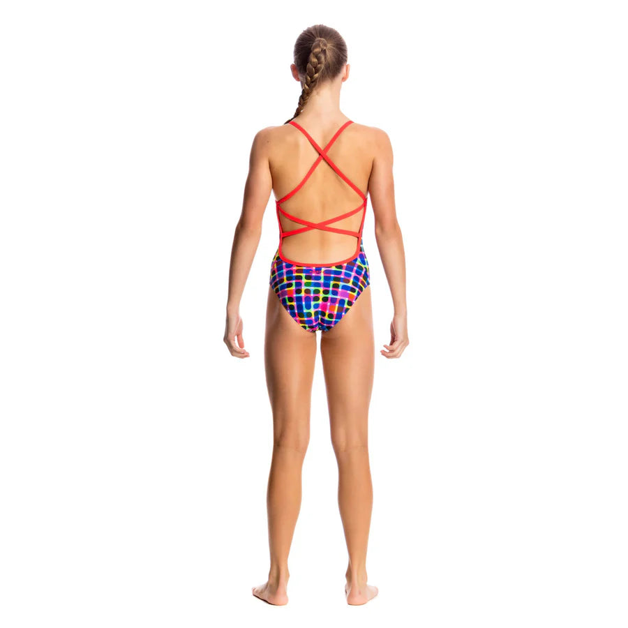 Mit dem Funkita Mädchen Trainingsbadeanzug Strapped In kannst du deinen Rücken gekonnt in Scene setzten. Die schmalen Träger laufen im Zick Zack über deinen Rücken und der Beinausschnitt ist extra hoch, damit du die größtmögliche Bewegungsfreiheit hast. Damit vorne nicht rausblitzen kann hat der Badeanzug ein Innenfutter im Frontbereich.