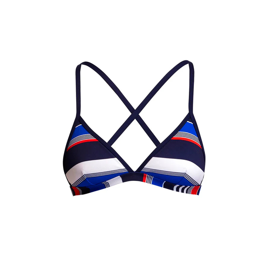 Die schmalen Träger des Funkita Tri Top Bikinioberteils verlaufen über Kreuz und werden im Rücken gebunden. Der Brustbereich ist dreieckig ausgeschnitten und hat ein elastisches Unterbrustband, wodurch das Top besonders gut sitzt. Zu diesem Angebot gehört nur das Oberteil, die Hose wird separat verkauft.