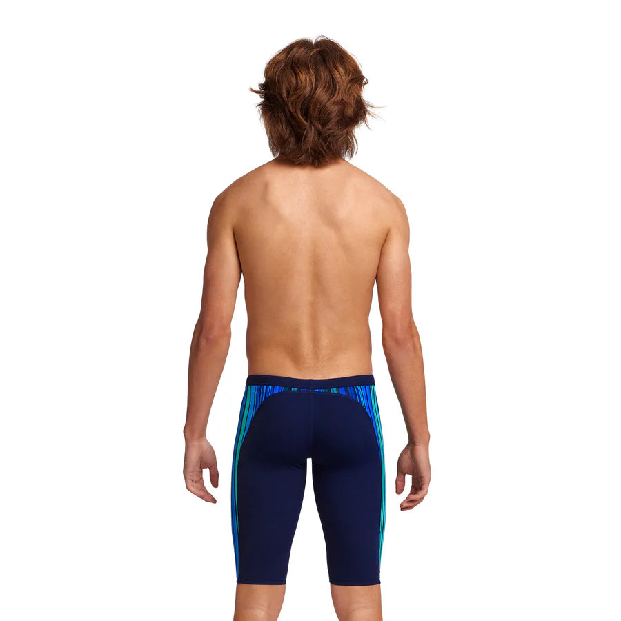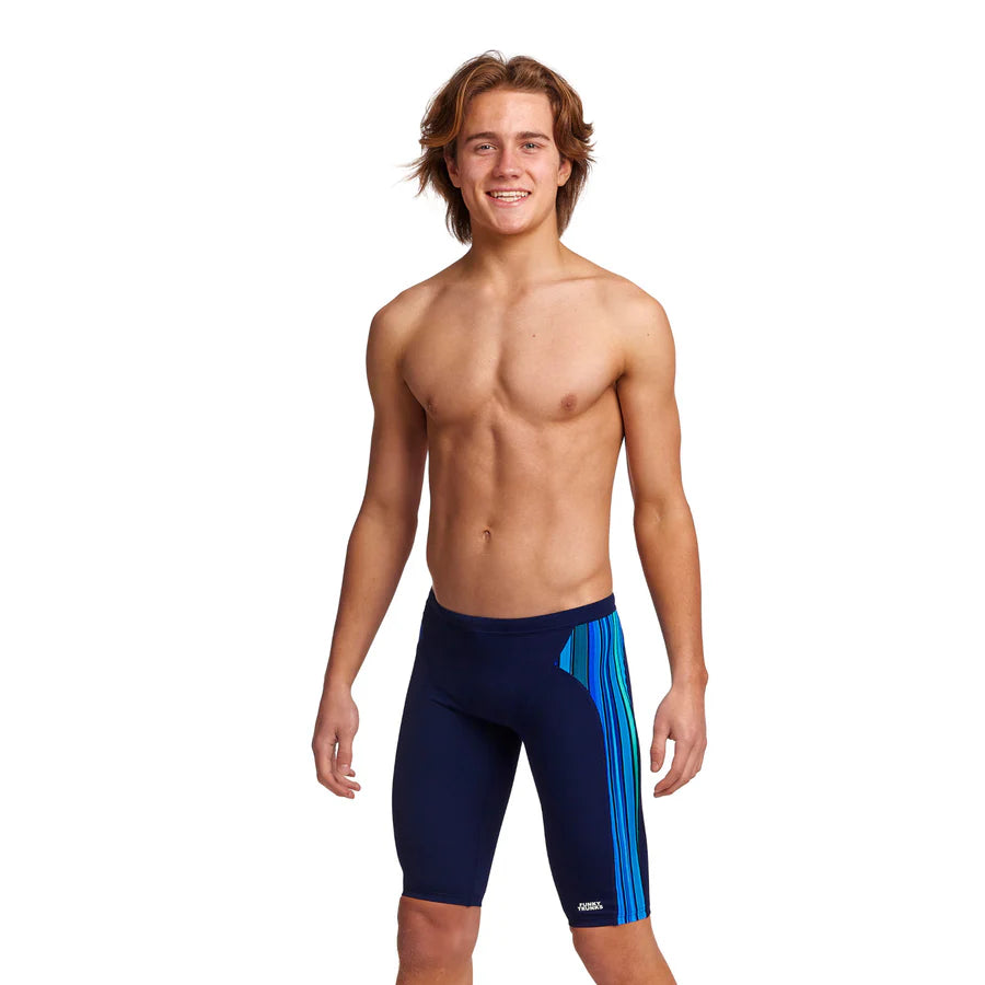 Der Jungen Trainings Jammer von Funky Trunks ist ein beliebtes Modell für Schwimmer und Triathleten. Die Nähte sind extra flach, die Beinöffnung ist bequem geschnitten und für den besten Halt versteckt sich im Bund ein Kordelzug. Der Zwickel hat ein leichtes Innenfutter, damit auch alles blickdicht ist.